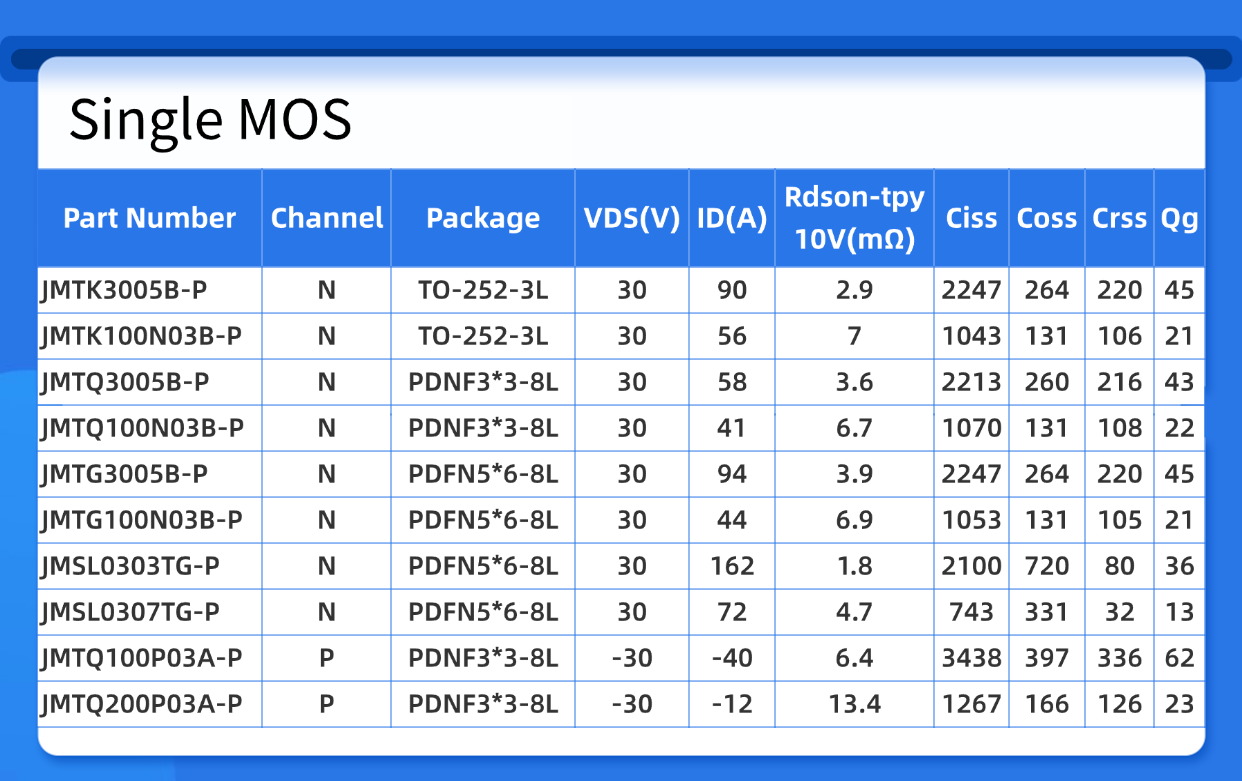 JMTK3005B-P/JMTK100N03B-P:采用Trench工艺,TO-252-3L封装,30V/90A规格下Rds(on)仅2.9mΩ